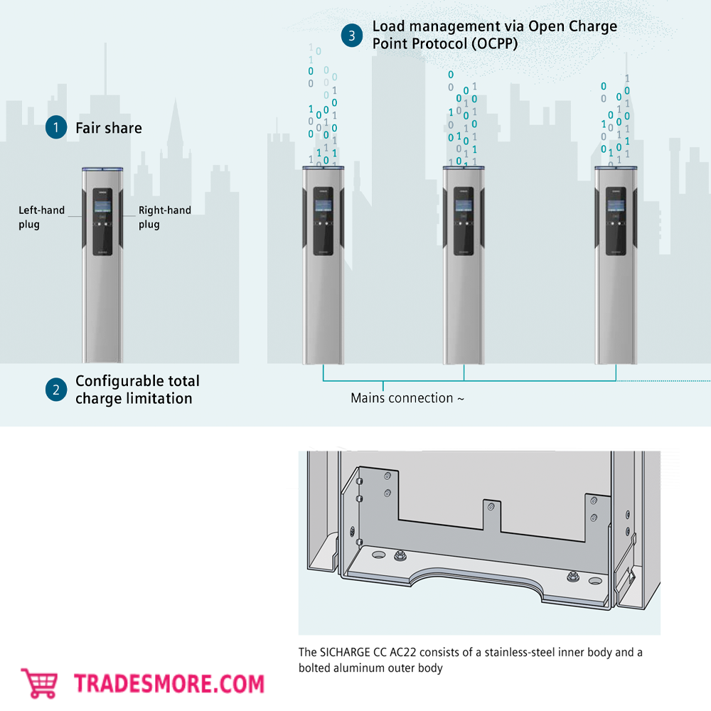 The SICHARGE CC AC22 permits the parallel charging of two electric cars. An internal load management system ensures the fair sharing of power between the two vehicles. When two cars are charged simultaneously, the load management system evenly distributes the available connection capacity to the two vehicles. A comprehensive load management system controlled via OCPP is available for the operation of multiple charging stations.